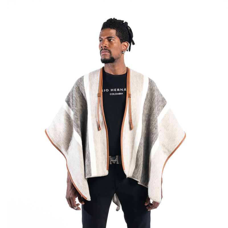 Las ruanas MARIO HERNÁNDEZ conservan la estructura y horma de las originales, así como las franjas que las caracterizan. Sin embargo, la marca les da un toque contemporáneo con una abertura frontal. Además, les agrega los ribetes de cuero en los laterales y la pechera, las tiras removibles de la parte frontal y las señas de identidad de la marca: el unicornio quemado en uno de los pasadores delanteros y el monograma MH que va en la parte posterior. ¿El resultado? Un balance perfecto entre dos oficios hechos a mano en una prenda que se convierte en expresión del lujo colombiano.