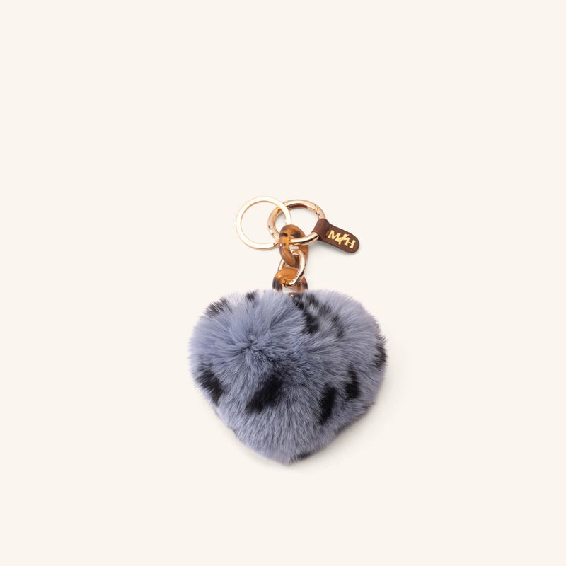 Este charm en forma de corazón destaca por su textura suave en pelo de conejo y un profundo tono cobalto que aporta un acento distintivo. Su diseño compacto incluye una argolla metálica funcional que permite asegurarlo fácilmente a bolsos o llaves, facilitando la personalización de sus accesorios diarios.