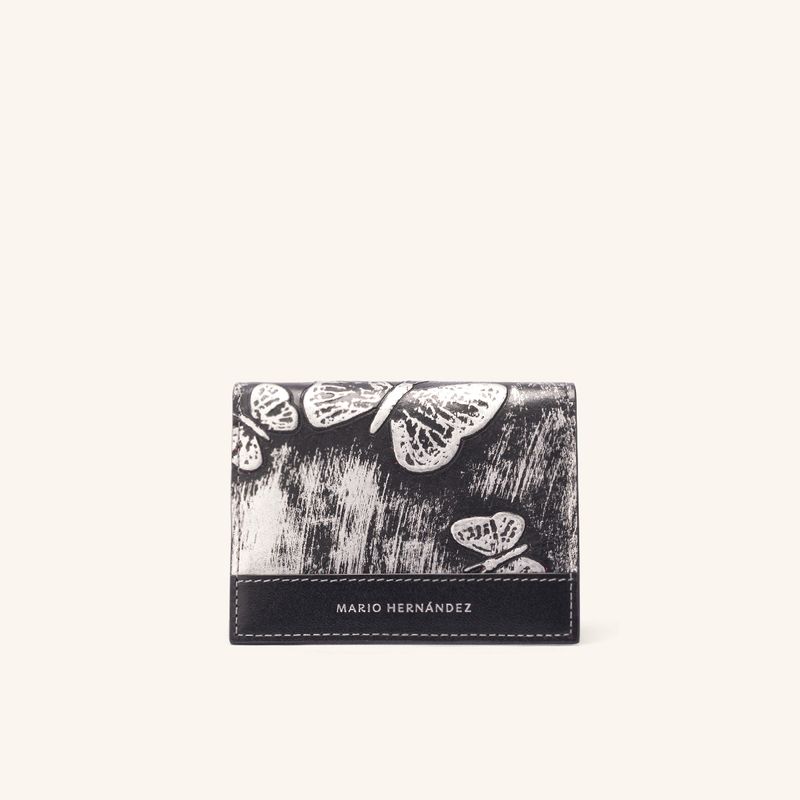 Esta billetera de cuero italiano presenta un efecto platinado con mariposas grabadas que evocan la herencia de la marca. Su tono metalizado, logrado mediante un proceso de tintura manual, ofrece una textura resistente y un estilo distinguido para el uso diario.