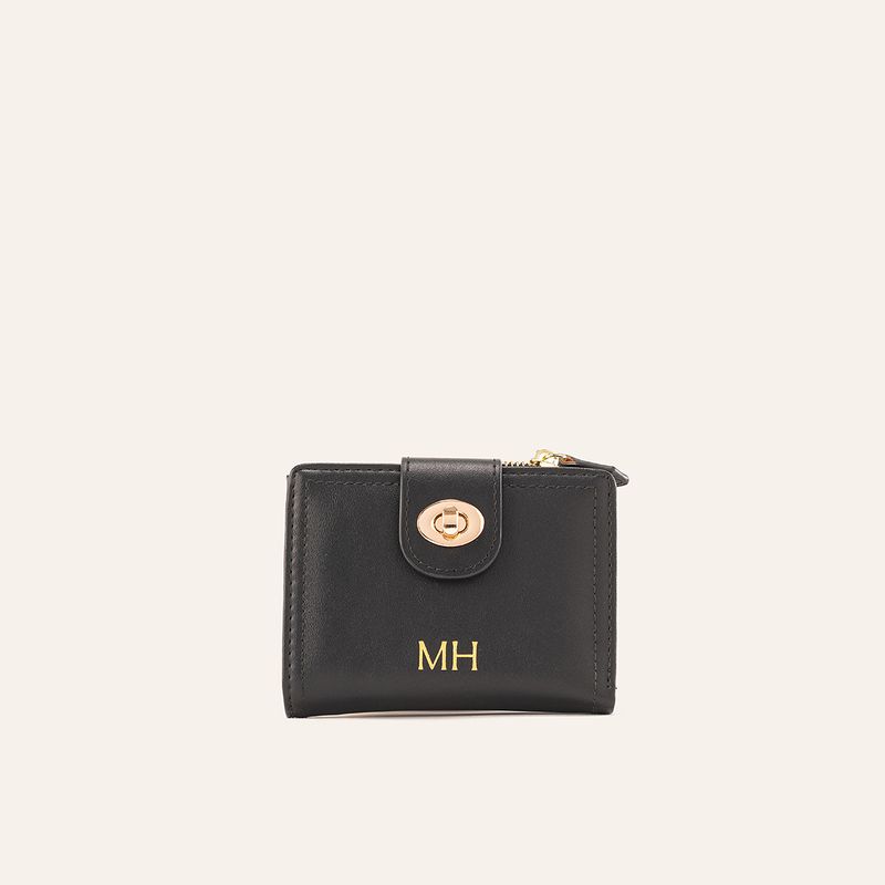 Esta billetera mediana en color negro destaca por su acabado en poliuretano de alta densidad, ofreciendo una textura suave y resistente para el uso diario. Su diseño funcional incluye un sistema de cierre de cremallera que asegura tus pertenencias, complementado con herrajes en zamac en tono en color oro claro que aportan un detalle distinguido al accesorio.