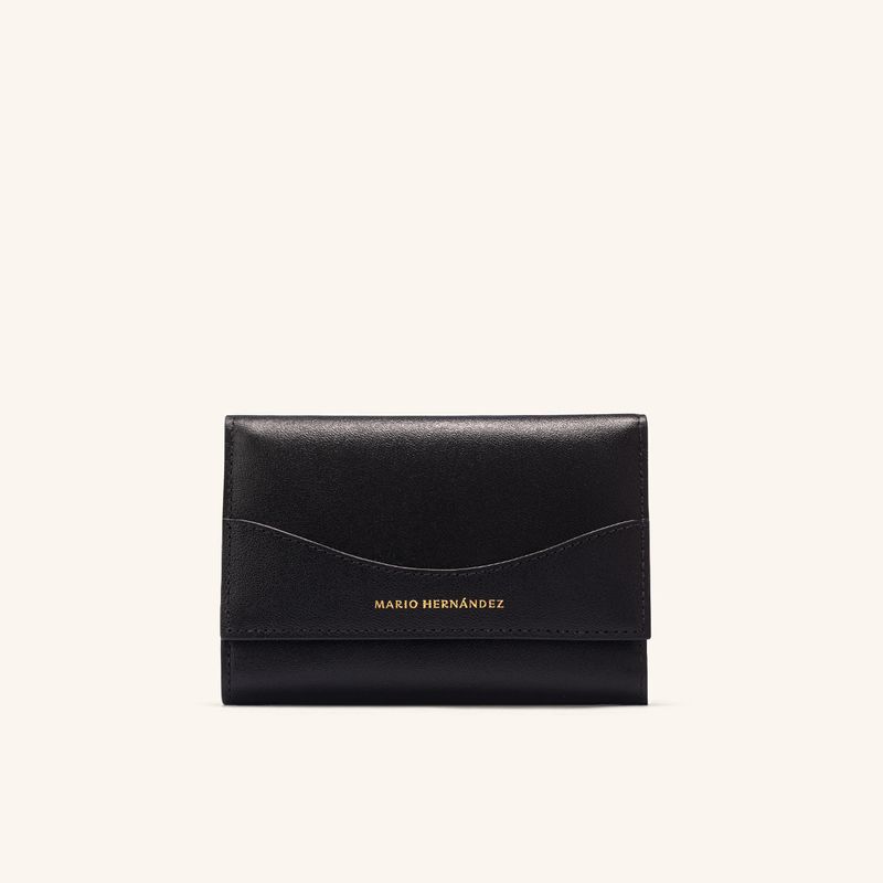 Esta billetera mediana está elaborada en cuero vacuno liso de tono negro con un acabado brillante que aporta distinción. Su diseño funcional organiza sus pertenencias mediante diez ranuras para tarjetas, un espacio para billetes y un bolsillo con cremallera para monedas o pequeños objetos. El cierre exterior destaca por un herraje en zamac con forma de ala de mariposa que asegura el contenido con estilo.