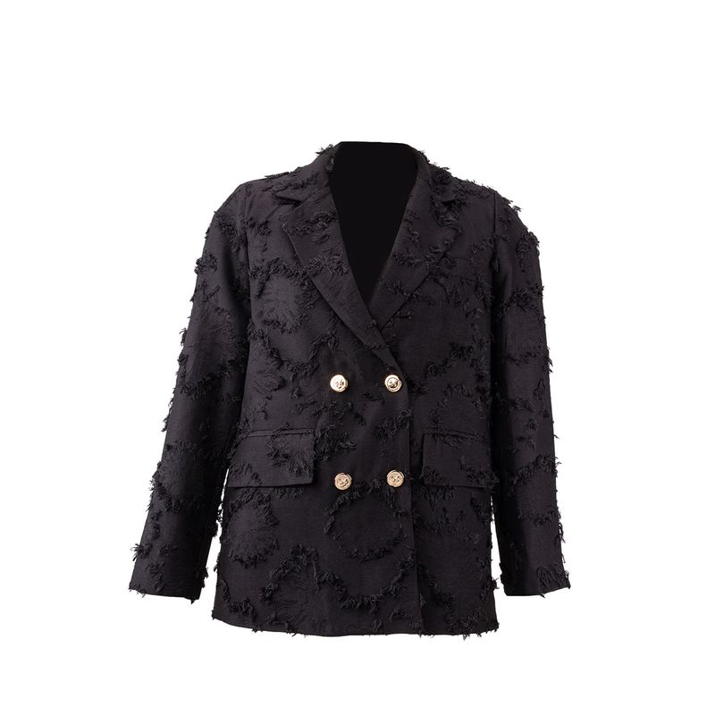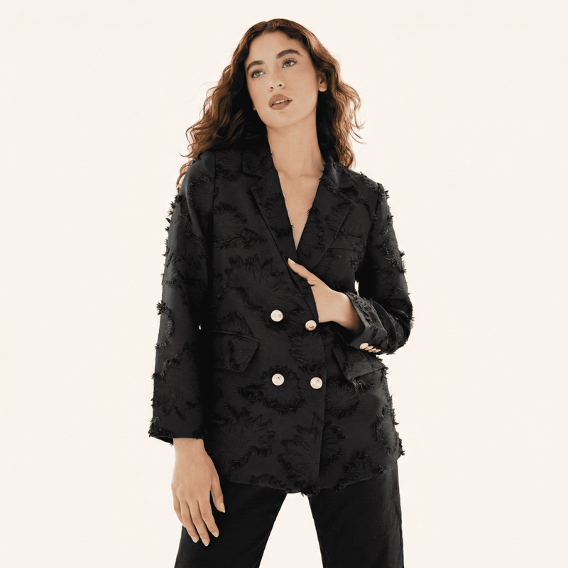 Este blazer de doble botonadura ofrece una sensación de suavidad y ligereza gracias a su mezcla de algodón y nailon en tono negro profundo. Su corte largo y estructurado proporciona una silueta distinguida que se adapta tanto a entornos profesionales como a salidas casuales, funcionando como una pieza esencial para cualquier fondo de armario.