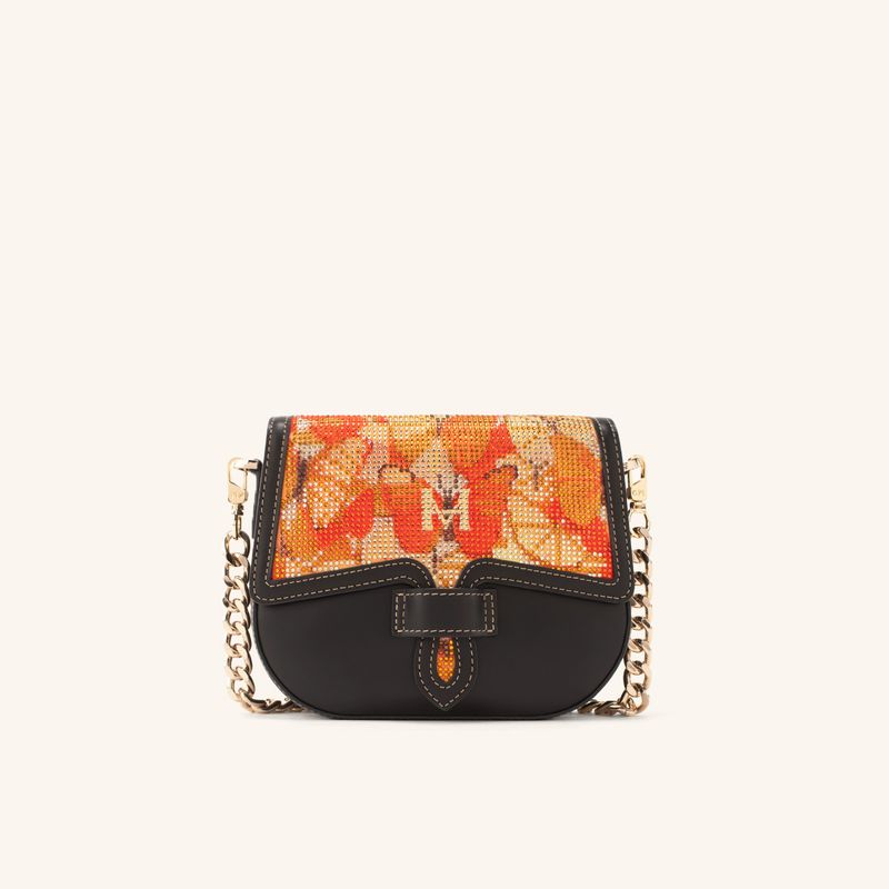 Este carriel en cuero bovino destaca por su tonalidad atardecer y la intervención de cristales de colores que aportan un acabado brillante. Su diseño incluye un sistema de cierre con broche y cremallera para resguardar pertenencias con seguridad, ofreciendo un espacio organizado para el uso diario o eventos sociales.