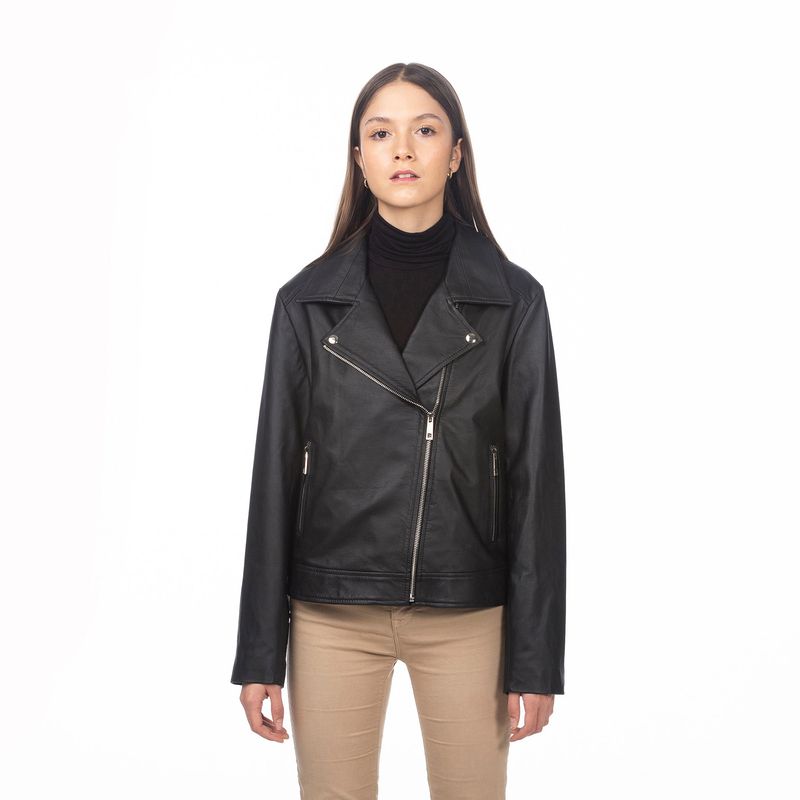 La chaqueta biker de cuero liso y cabrito tiene un estilo contemporáneo, pero atemporal. Su silueta es más corta que la tradicional y te ofrece remaches metálicos en la solapa. Cuenta con cierre de cremallera y dos prácticos bolsillos frontales. Ideal para complementar tus atuendos casuales. Viene en tres colores: negro, camel y granate.