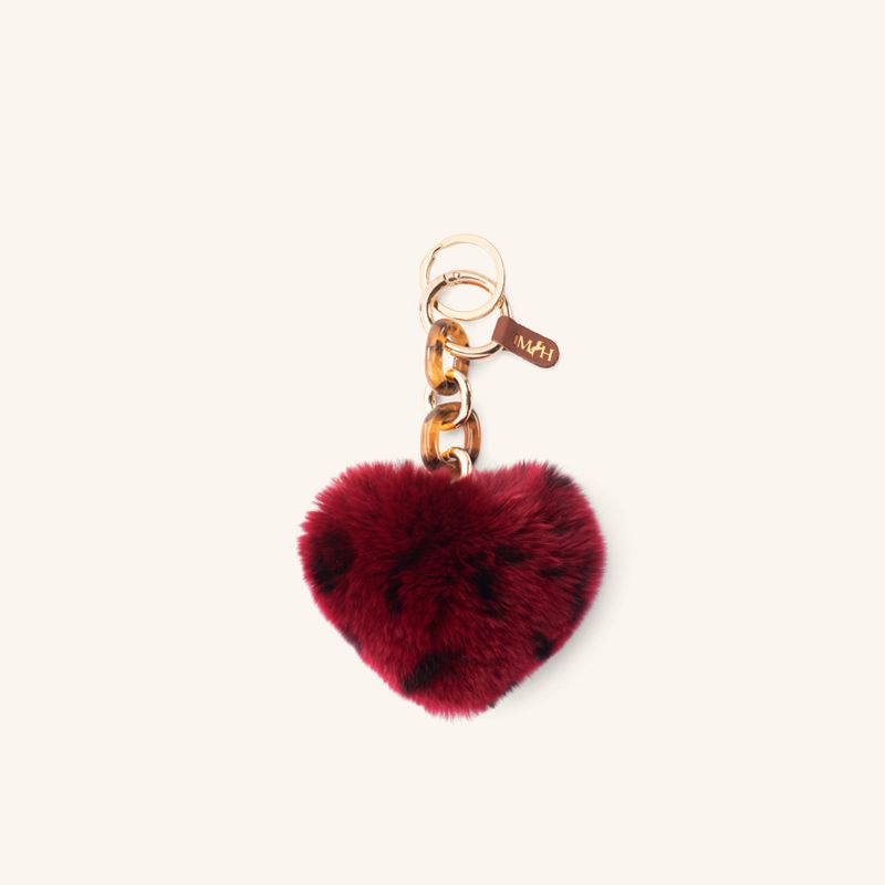 Este charm de la colección Suspiros destaca por su textura suave en pelo de conejo y su vibrante tono magenta oscuro. Su diseño en forma de corazón es ideal para personalizar bolsos o llaves, mientras que la argolla metálica asegura un enganche firme y duradero.