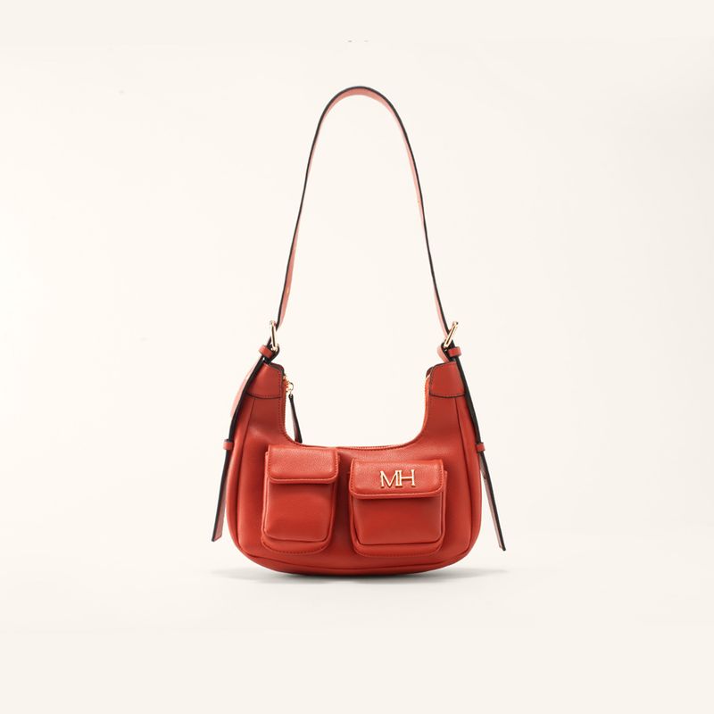 Ideal para entornos profesionales y compromisos sociales, su color ladrillo aporta un aire distinguido que combina fácilmente con vestuario ejecutivo. Los herrajes en zamac con acabado en color oro claro y el logo MH metálico añaden un detalle elegante y duradero al diseño.
