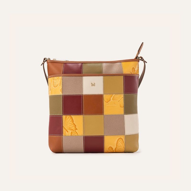 Este manos libres en tono miel presenta un diseño de patchwork que combina diversas texturas de cuero para crear un efecto visual ajedrezado. Su tamaño compacto es ideal para llevar lo esencial con comodidad, ofreciendo una estructura ligera que se adapta al movimiento diario.
