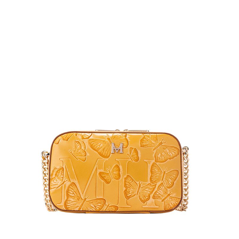 El amarillo quemado, ese que recuerda el color de la mostaza Dijón, le pone un toque otoñal a esta versión de la colección emblemática de la marca, que hace que las mariposas resalten sobre el piel, gracias a un efecto "quemado", creado manualmente en Italia mediante una técnica conocida como tamponado. El tono protagonista contrasta, y a la vez se complementa de manera armoniosa, con un cuero liso canela que baña las manijas y la base de carteras y billeteras.