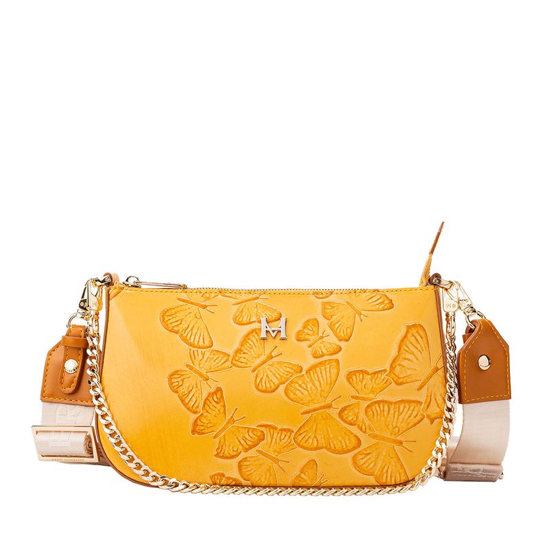 El amarillo quemado, ese que recuerda el color de la mostaza Dijón, le pone un toque otoñal a esta versión de la colección emblemática de la marca, que hace que las mariposas resalten sobre el piel, gracias a un efecto "quemado", creado manualmente en Italia mediante una técnica conocida como tamponado. El tono protagonista contrasta, y a la vez se complementa de manera armoniosa, con un cuero liso canela que baña las manijas y la base de carteras y billeteras.
