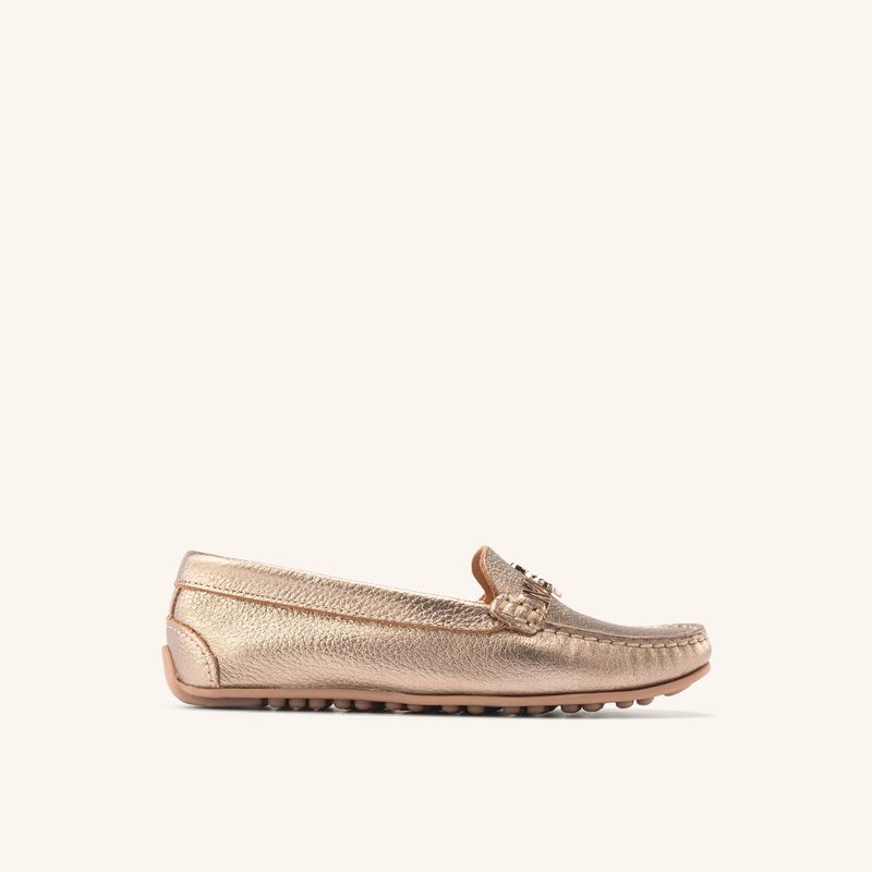Este mocasín de horma clásica destaca por su cuero vacuno con acabado metalizado en tono oro, ofreciendo una estética contemporánea y audaz. Su diseño ligero y flexible asegura comodidad durante el uso prolongado, adaptándose con suavidad al movimiento natural del pie.