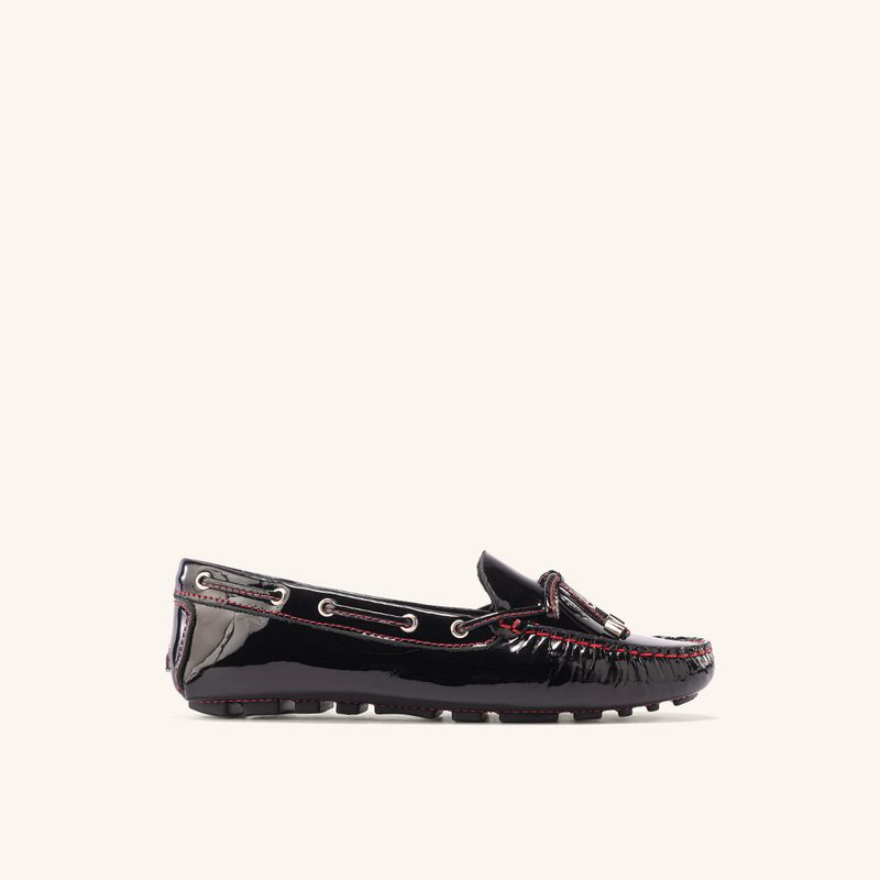 Driver de suela partida realizado en cuero vacuno liso semi-brillante y charolado. El mocasín se adorna con un el íconico herraje Monograma en forma de dije acabado en níquel brillante.