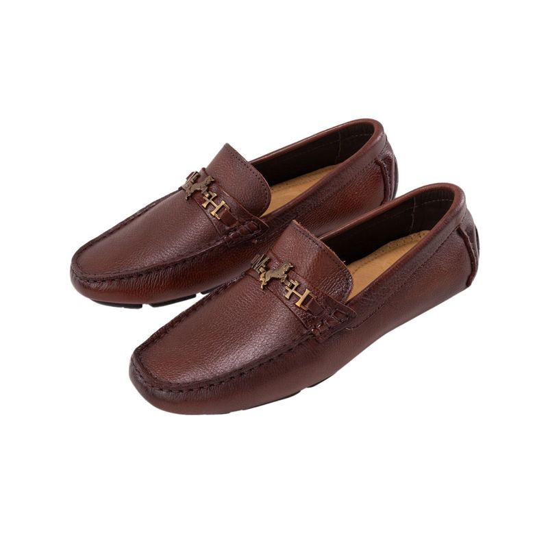 Este mocasín driver en tono caoba destaca por su cuero de grano natural tipo floater, que ofrece una sensación de ligereza y suavidad al caminar. Su diseño incluye un acabado esfumado artesanal en degradé y un herraje de unicornio que complementa la estética del calzado.