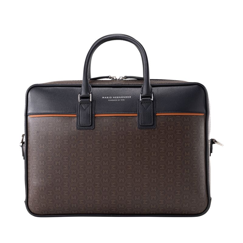 Este portafolio, ligero y de diseño impecable, presenta un innovador patrón MH Palenque con ondas entrelazadas, elaborado en lona sintética texturizada y detalles en cuero vacuno liso. Su construcción limpia y su tonalidad café lo hacen ideal para el hombre contemporáneo que busca funcionalidad y estilo en su día a día. Los herrajes en zamac con acabados en níquel y negro níquel complementan su diseño, ofreciendo durabilidad y un toque distinguido.