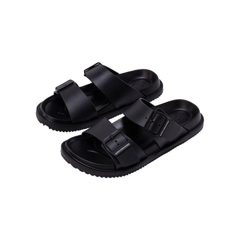 Estas sandalias de goma en tono negro ofrecen una estructura impermeable y resistente al uso frecuente. Su diseño de doble correa asegura un ajuste práctico, ideal para días de playa, vacaciones o el descanso en casa.
